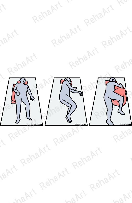 ●ベッドポジショニング(角度別側臥位):30°(左)、側臥位(中央)、前傾側臥位(右)