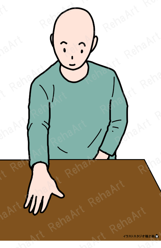 ●上肢卓上保持練習(代償動作抑制):代償動作を出さないよう注意しながら上肢を挙上位で卓上に保持する練習方法。