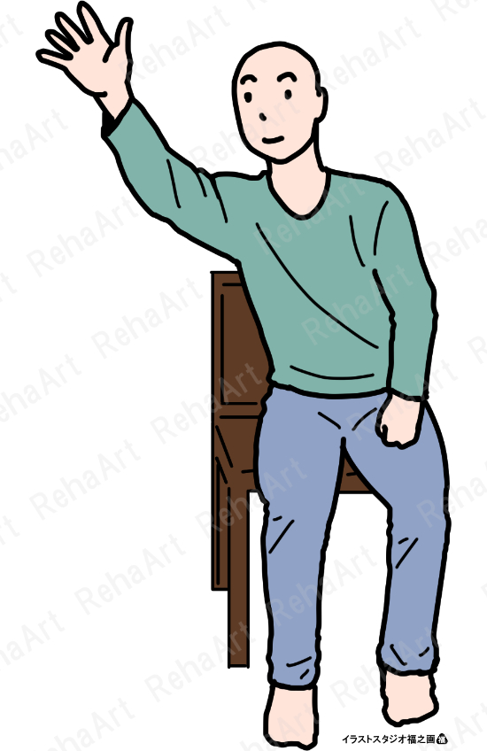 ●側方リーチ動作練習(挙上位保持):実用的な上肢挙上位動作獲得を目的に上肢挙上位を保持しながらボールをキャッチする等の課題動作を行う練習方法。