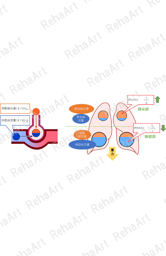 ●換気血流比不均等(解説図):換気血流比は正常であっても重力の影響を受けて部位や体位で異なることを解説した図