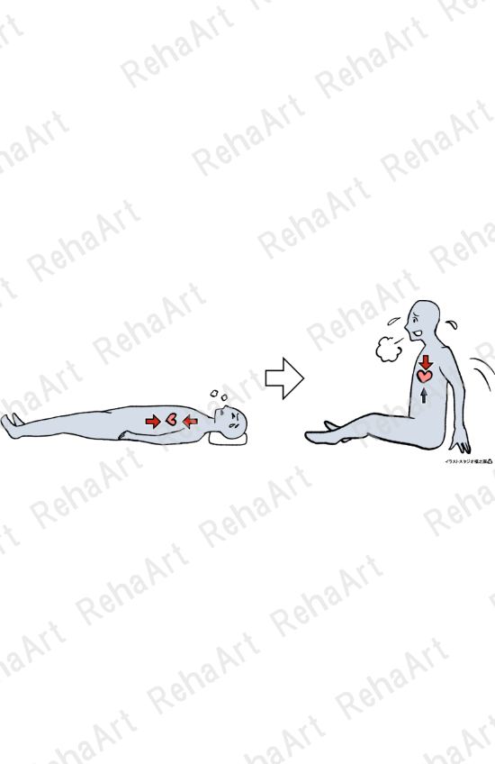 ●起座呼吸:下肢に貯留していた血液が臥位になることで頭側へ移動し、肺内血液量の増加、肺うっ血により呼吸困難感が生じる様子