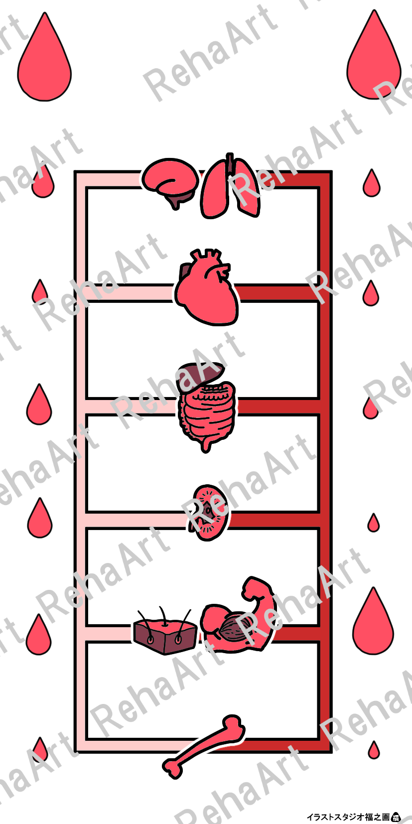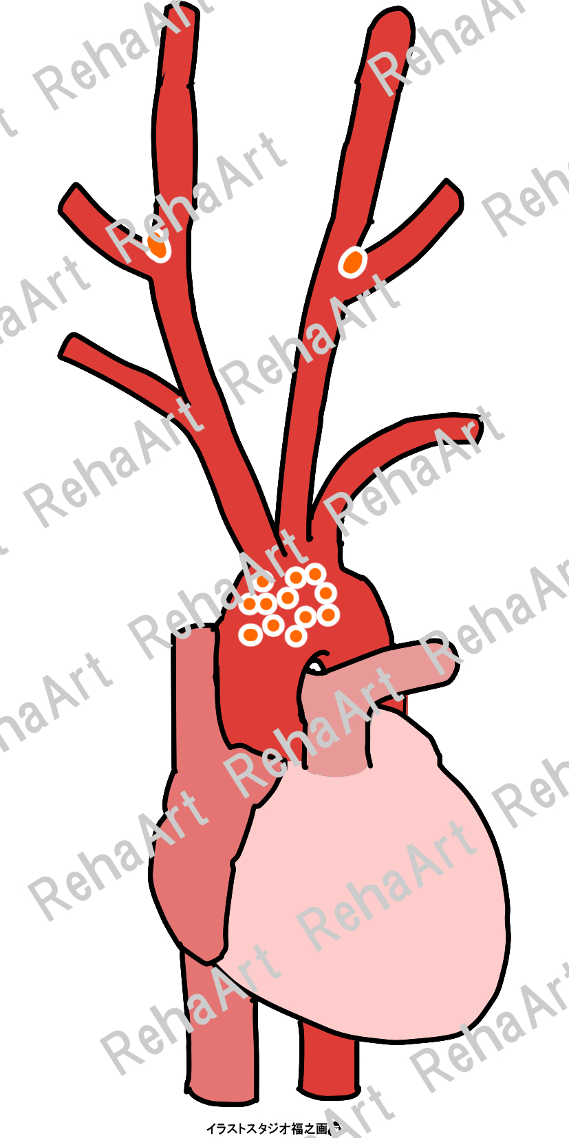 心臓の刺激伝導系・灌流域・血流分配等のイラストです。 ・刺激伝導系:心房から心室へと電気的興奮を伝える心臓を収縮させるシステム ・心拍出量の規定因子:前負荷、後負荷、心筋収縮能、心拍数の4つの因子 ・血流分配:安静時と運動時では臓器ごとで血流配分が大きく異なる図 ・化学受容器:総頚動脈分岐部にある頸動脈小体や大動脈弓周辺にある大動脈小体 ・冠動脈の灌流域:心臓の血管(冠動脈)と灌流域の図
