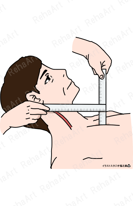 ●頸静脈怒張(測定):胸骨柄を基準に内頸静脈の拍動を評価する図