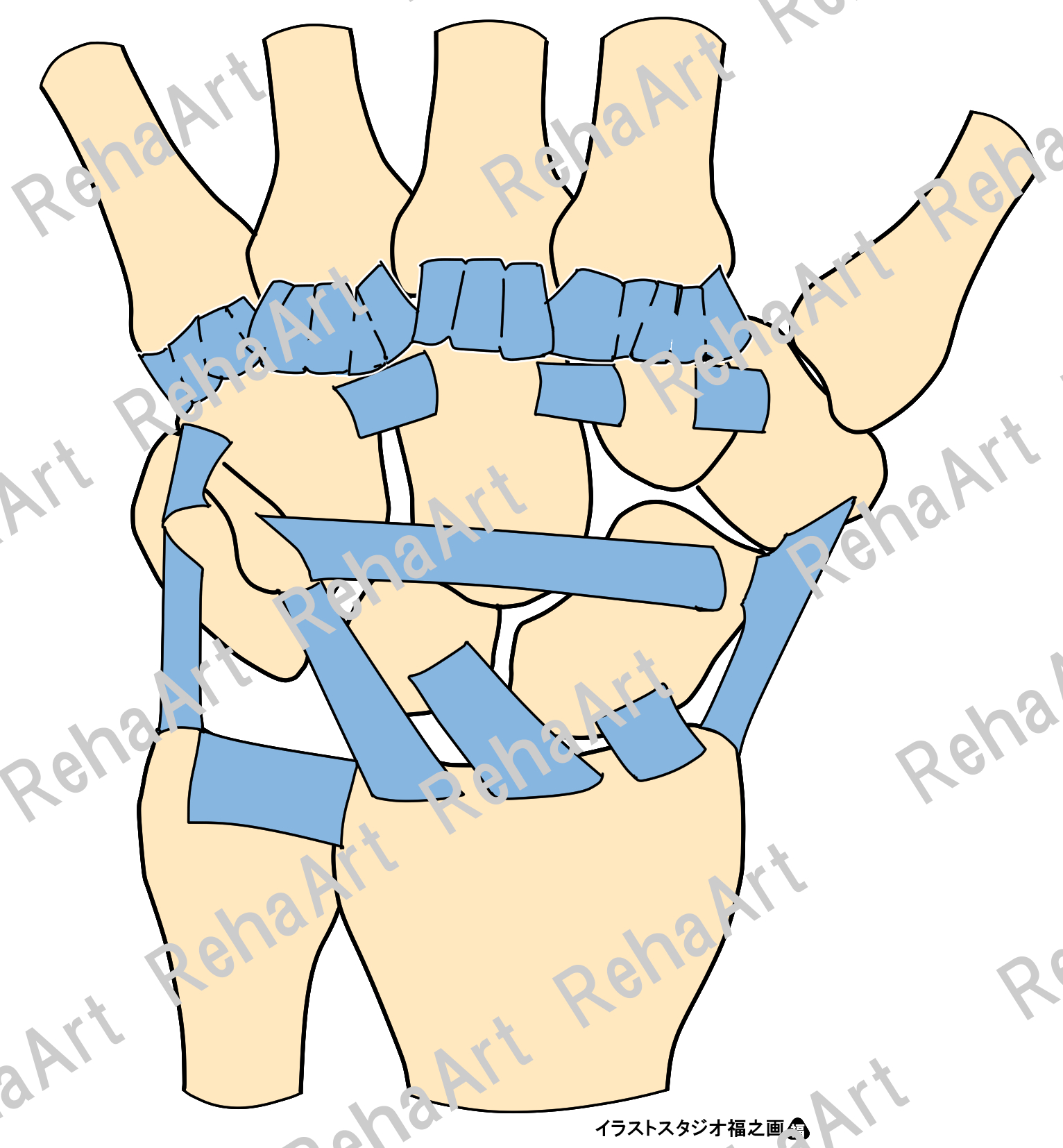 ・手関節靭帯(背側):背側手根間靭帯・三角鉤状靭帯・内側手根側副靭帯・背側橈尺靭帯・背側手根間靭帯・外側手根側副靭帯・背側橈骨手根靭帯・背側手根中手靭帯のイラストです。