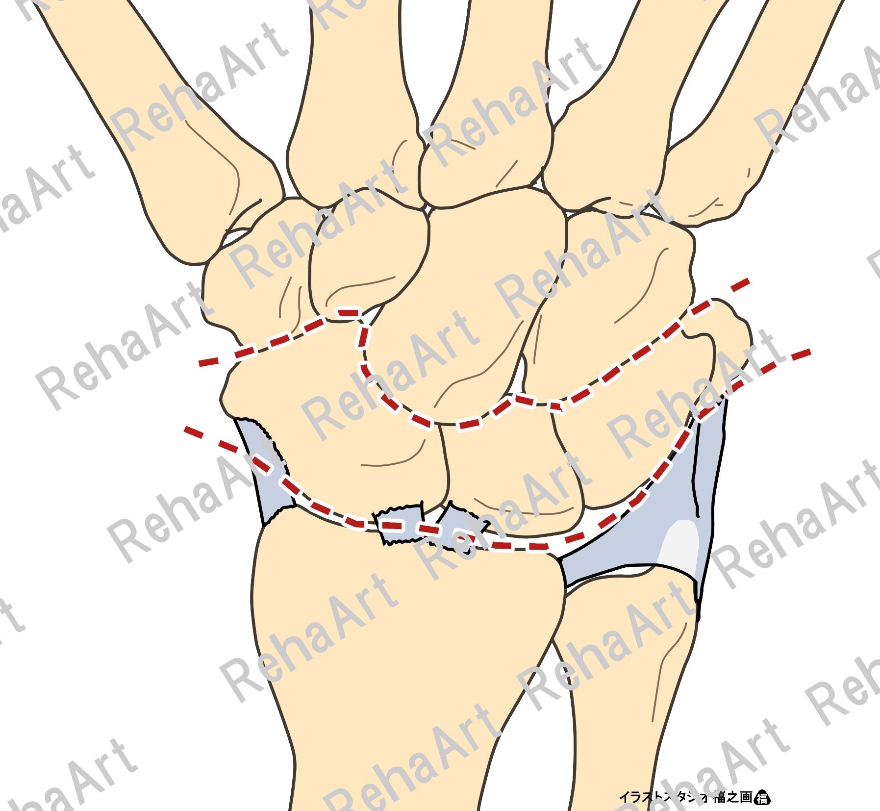 ・橈骨手根関節・手根間関節:橈骨手根関節は橈骨と近位手根骨で形成、手根関節は舟状骨・月状骨・三角骨と大菱形骨・小菱形骨・有頭骨・有鉤骨の間を示すイラストです。