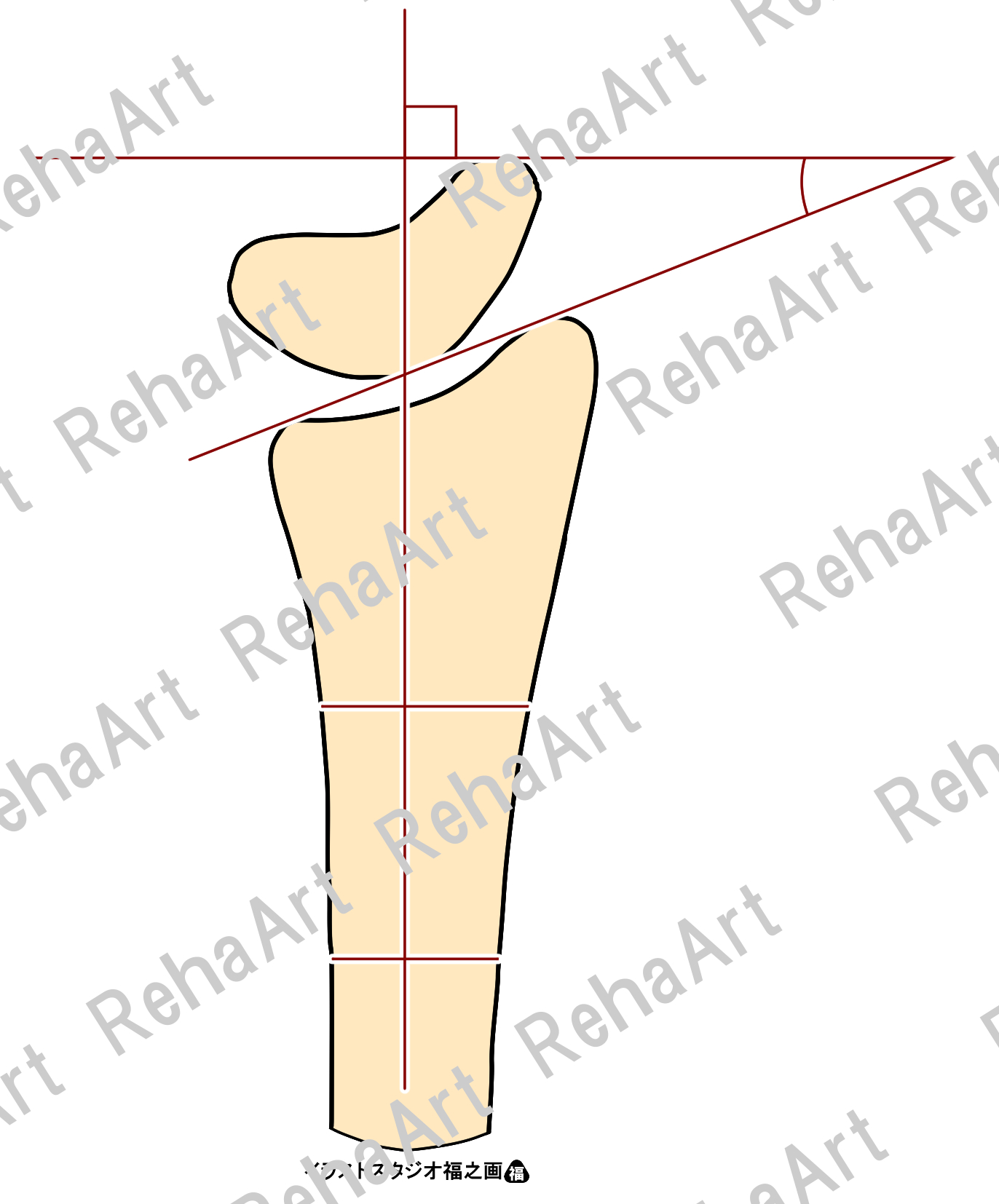 ・橈骨関節面:橈骨関節面は尺骨側へ約20°傾斜+手掌側へ約14°の傾斜があることを描いたイラストです。