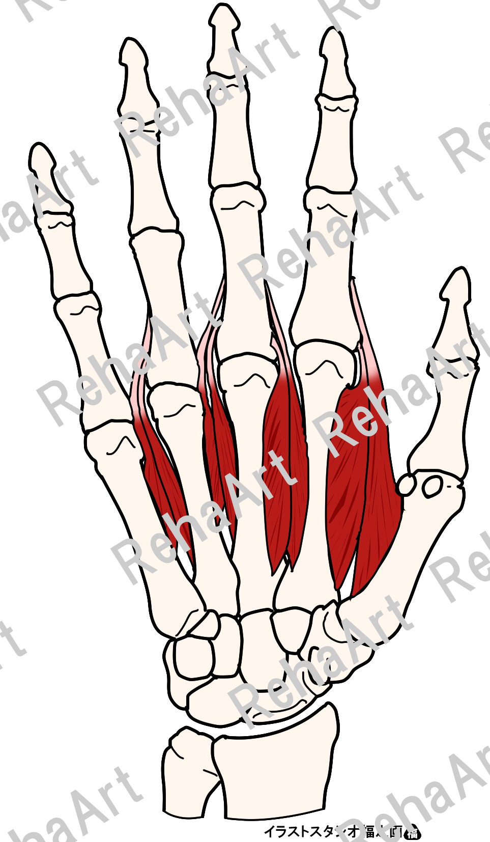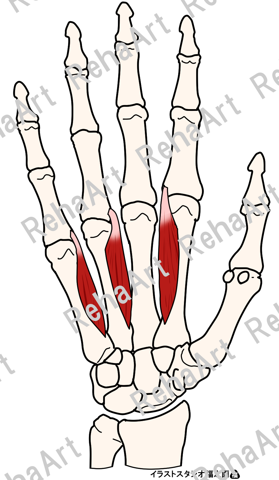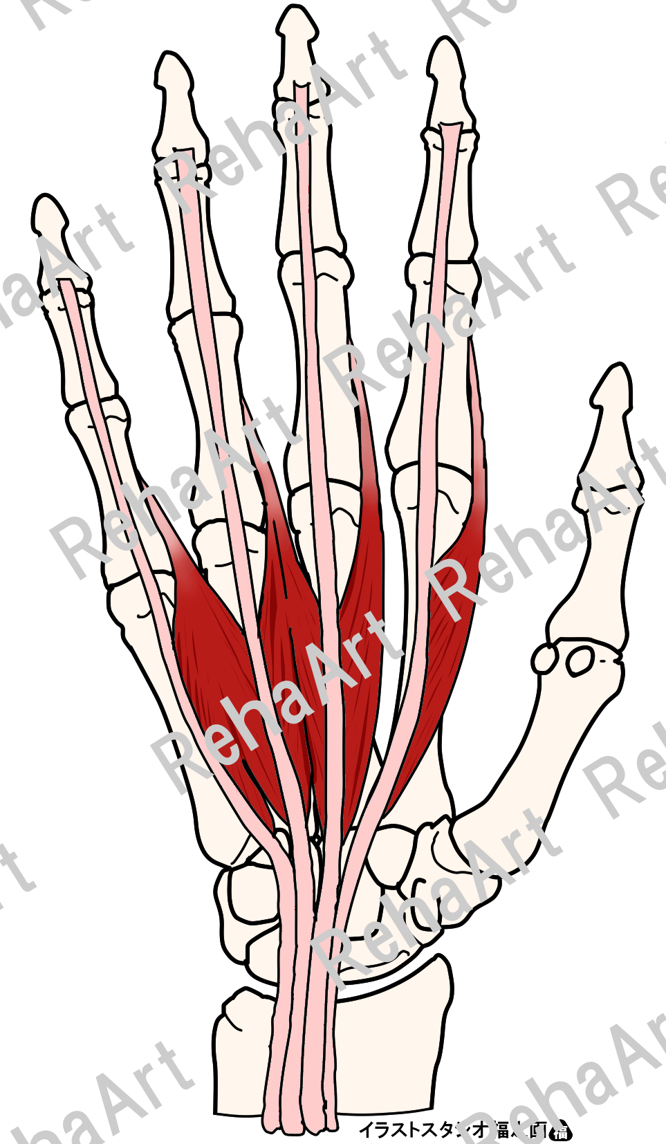 手関節の細かい巧緻的な動きに作用する手内在筋1のイラストです。
