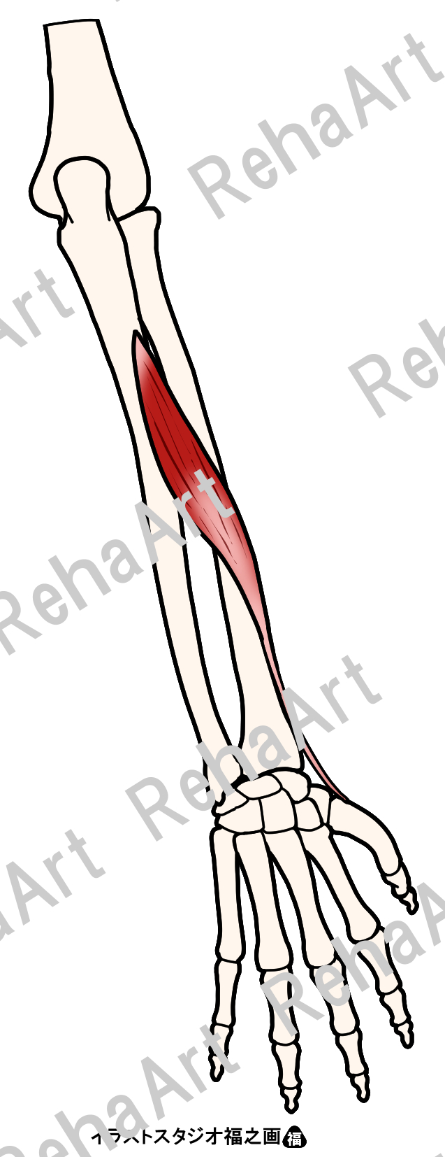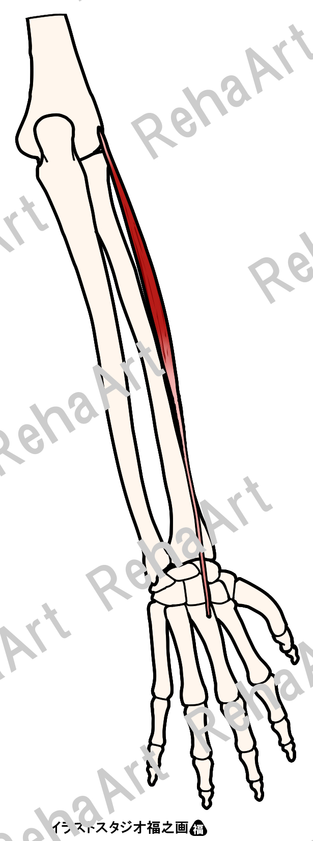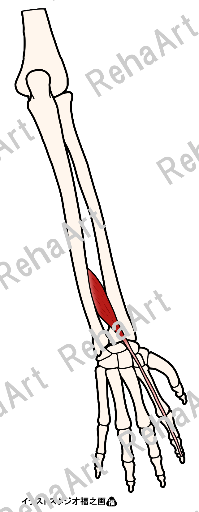 手内在筋と協調的に働き手指関節の動きに作用する手外在筋3のイラストです。 ・長母指外転筋 ・長母指伸筋 ・示指伸筋 ・長橈側手根伸筋 ・短橈側手根伸筋