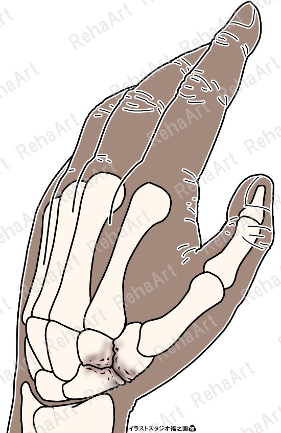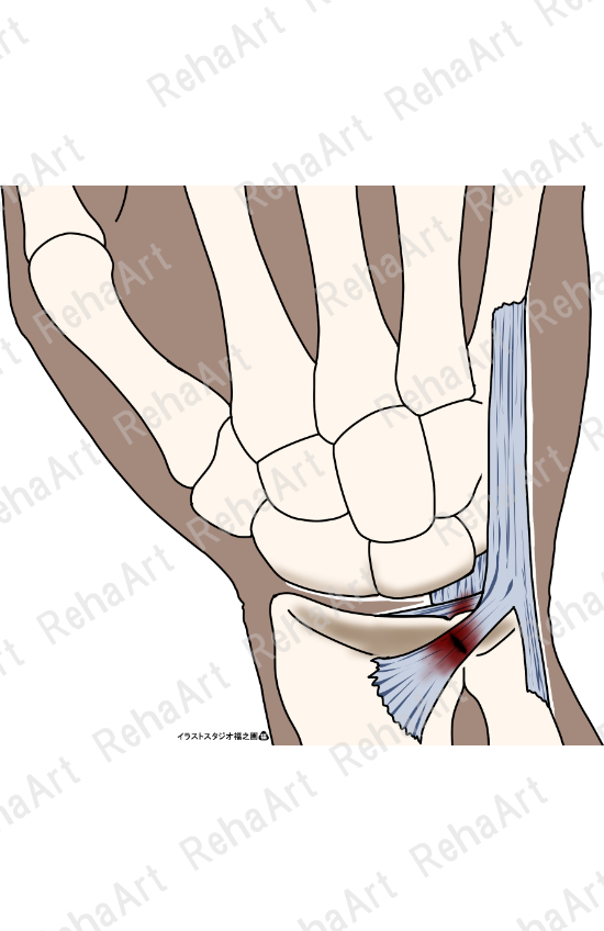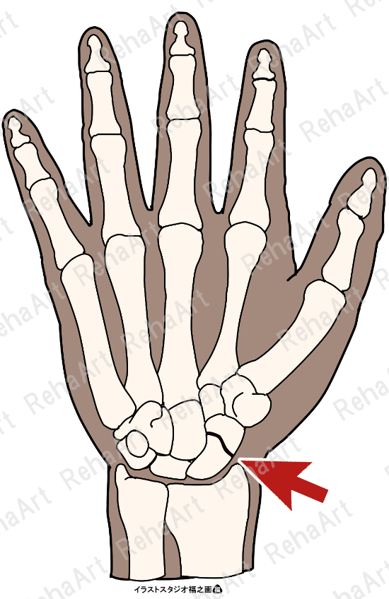 手関節疾患のイラストです。 ●コーレス骨折 ●三角繊維軟骨複合体損傷 ●舟状骨骨折 ●舟状・大菱形・小菱形骨間関節症 ●母指手根中手関節症