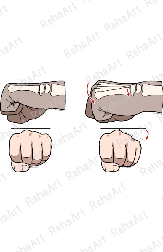 手根骨の可動性や手部の拘縮、そして、握力測定の肢位についてのイラストです。 ●橈骨手根関節・手根中央関節・運動評価:手関節の背屈・掌屈に伴う手根骨の動きと評価 ●握りアーチ:握りこむことで第4・第5手根中手関節は屈曲したアーチとなる ●デュピュイトラン拘縮:手掌腱膜の肥厚による拘縮 ●握力測定(手指肢位):手指の肢位で異なる握力測定の値 ●握力測定(手関節肢位):手関節の肢位で異なる握力測定の値