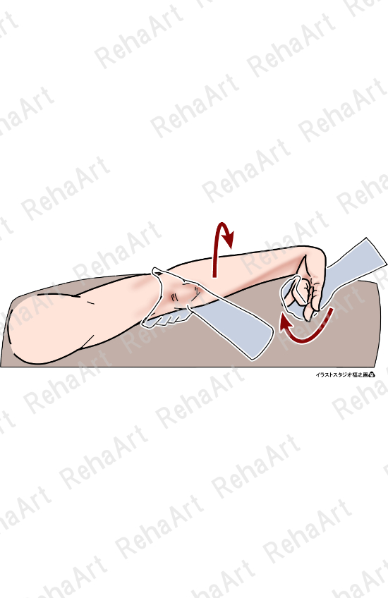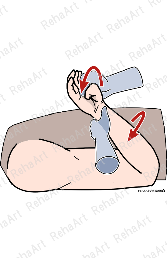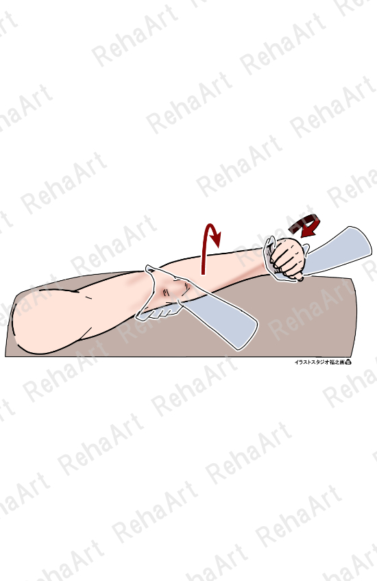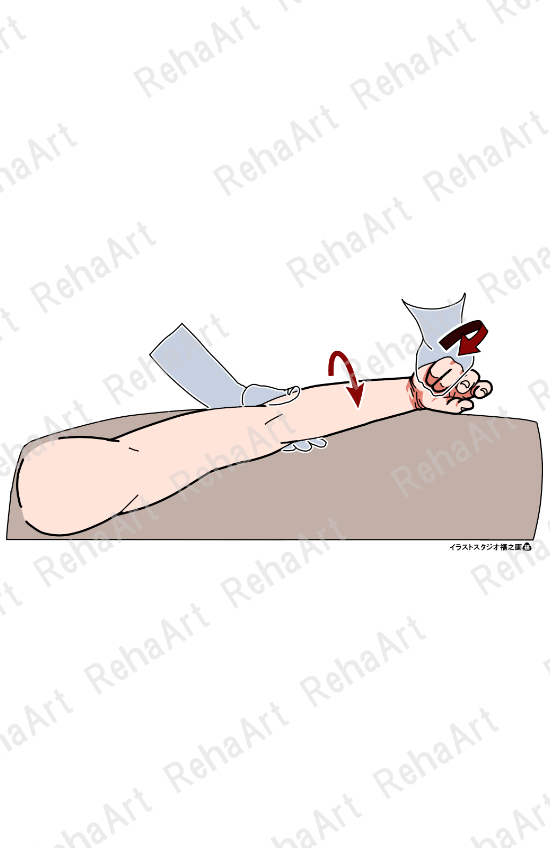 ●(長・短)橈側手根伸筋ストレッチング:肘関節伸展・前腕回内位⇒手関節掌屈