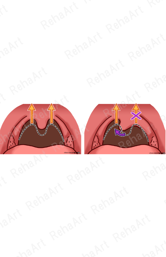 ●カーテン徴候(正常・異常):正常(左)では軟口蓋と一緒に左右対称に口蓋垂は挙上するが、カーテン徴候(右)では健側の口蓋垂が挙上することを表した図