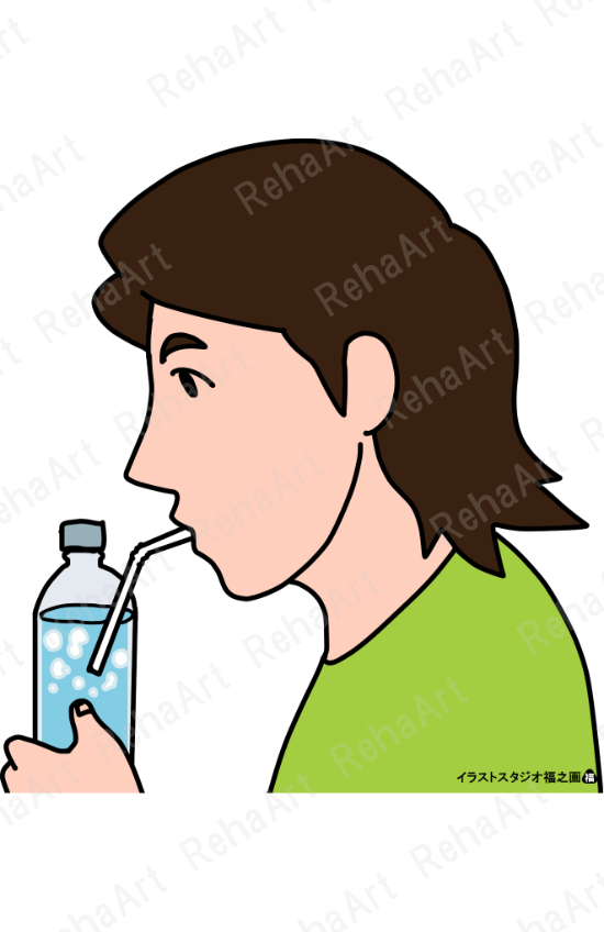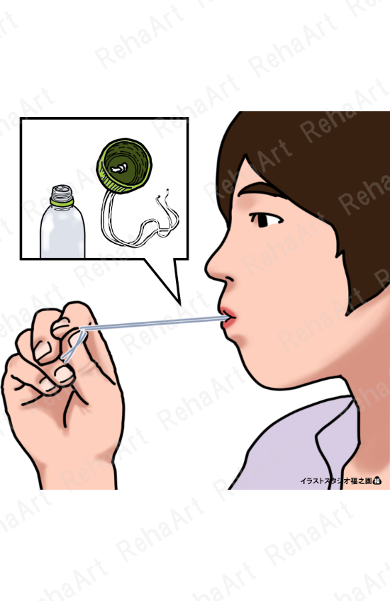 ●ブローイング訓練:口から息を出すことができるか確認する方法でもあり、鼻咽腔閉鎖に関わる神経や筋群の機能改善を図る訓練を、ペットボトルを用いて行っている図