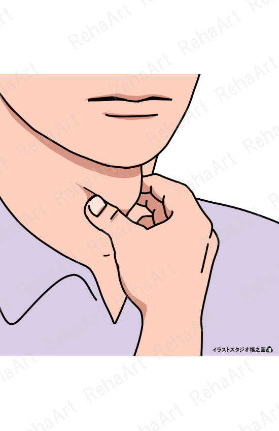 ●喉頭挙上運動評価:甲状軟骨の動きを手指で触知して喉頭挙上量と挙上力を評価している図