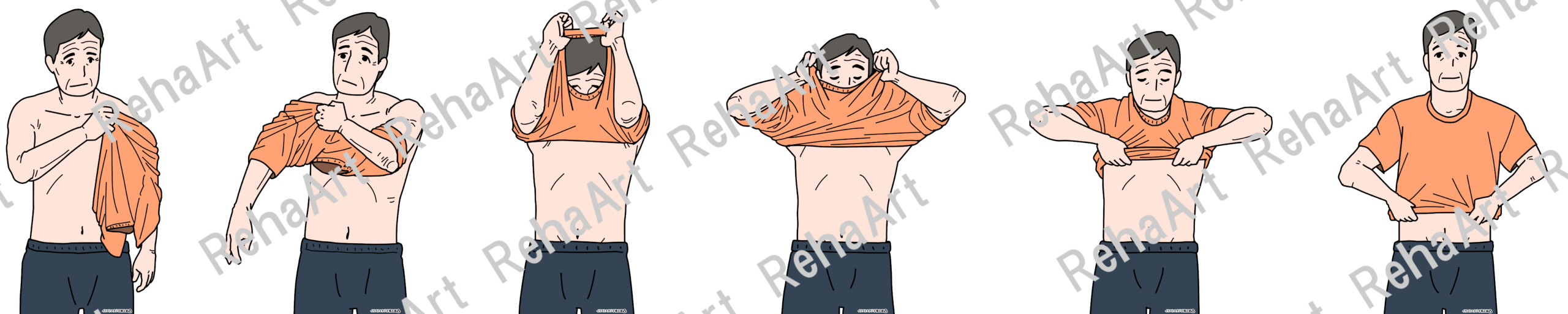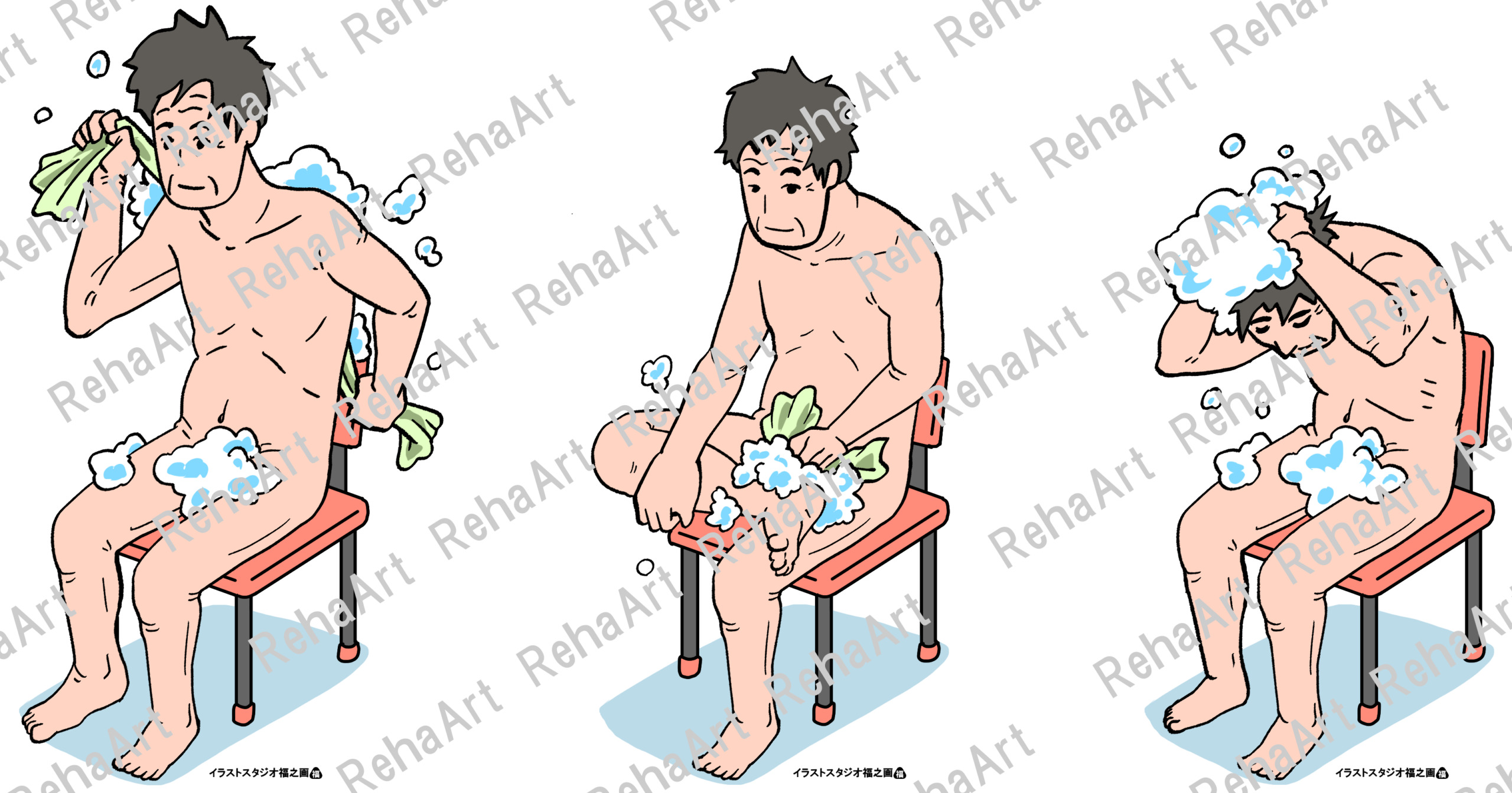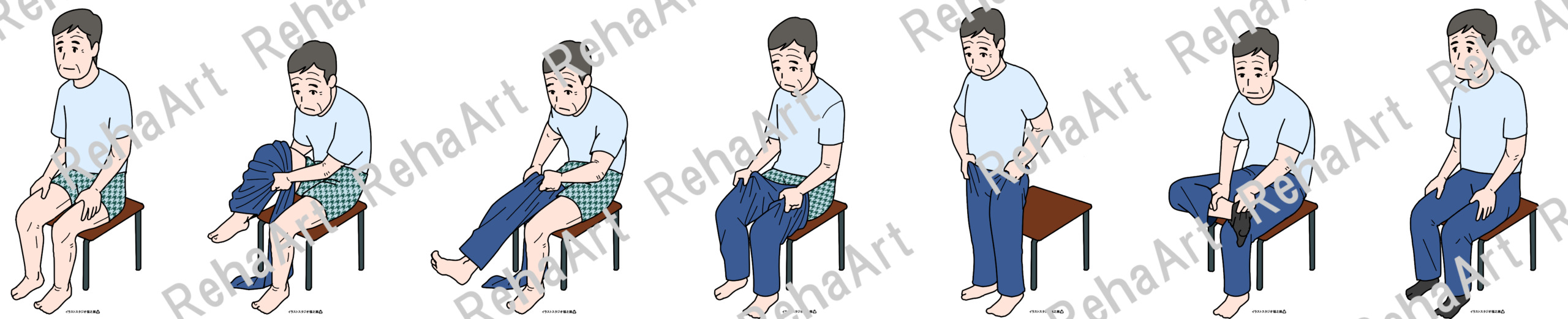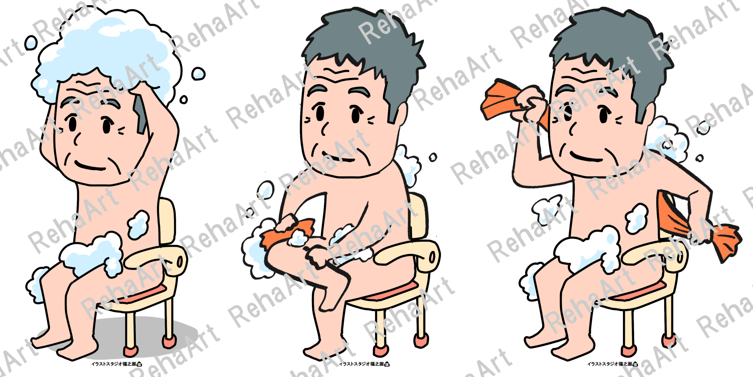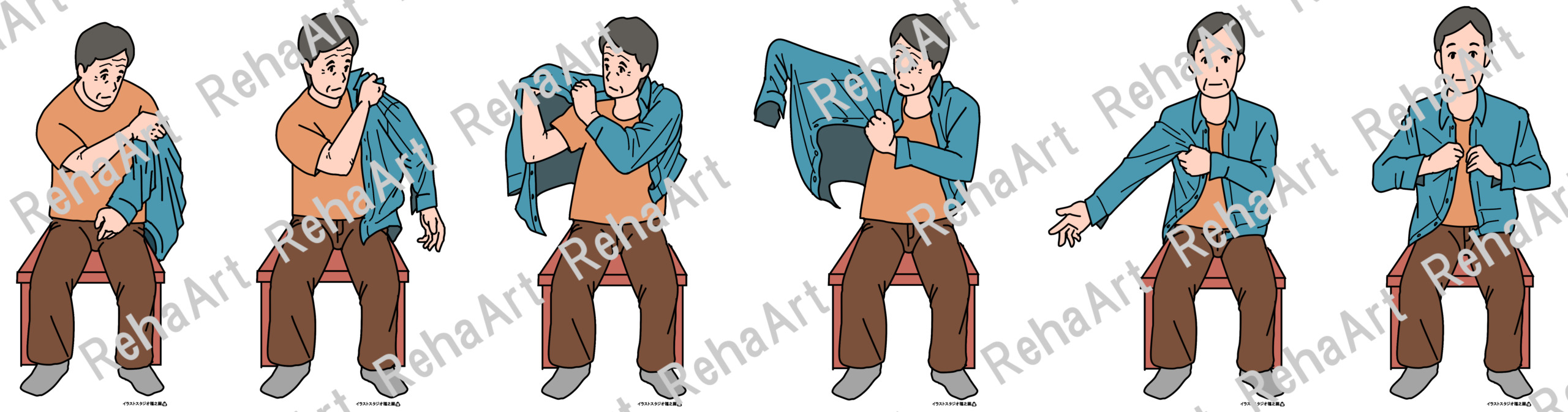 生活動作である更衣動作と洗体動作のイラストです。 ・更衣動作(かぶりシャツ):かぶりシャツの更衣動作6つの相 ・更衣動作(前開きシャツ):前開きシャツの更衣動作6つの相 ・更衣動作(ズボン・靴下):ズボンや靴下を更衣動作6つの相 ・洗体動作:背面・下肢・洗髪それぞれの洗体動作 ・洗体動作(キャラクター):洗体動作を3頭身程度のキャラクターで描写