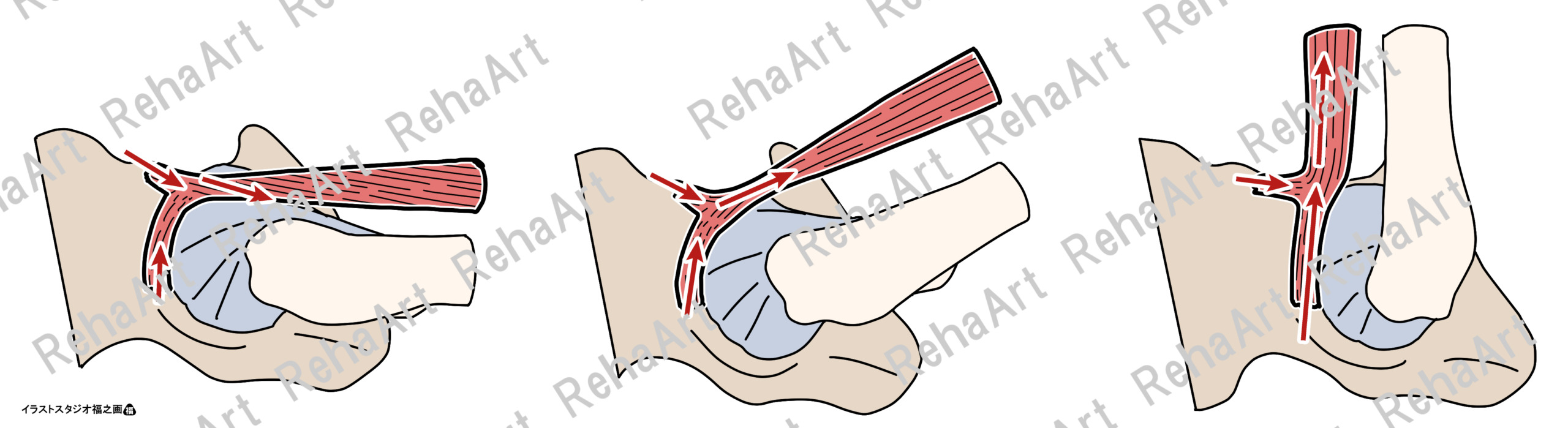 大腿直筋・大殿筋・中殿筋・小殿筋のイラストです。 ・大腿直筋(反回頭):股関節屈曲角度ごとの位置関係 ・大腿直筋(third head):小殿筋に付着する大腿直筋のthird head ・中殿筋機能:運動軸と線維の位置関係で異なる中殿筋機能 ・小殿筋 ・大殿筋機能:運動軸と線維の位置関係で異なる大殿筋機能