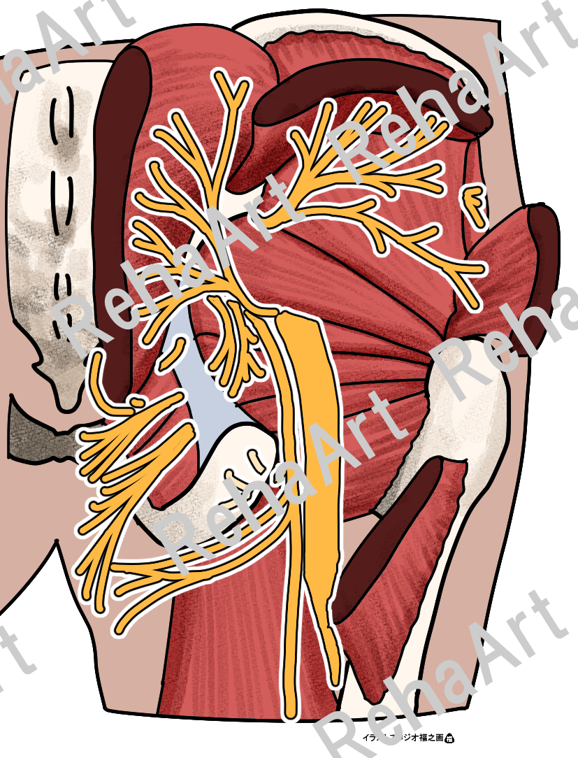 股関節周囲を走行する大殿神経・坐骨神経等のイラストです。 ・仙骨神経叢・腰神経叢:上殿神経・下殿神経・坐骨神経、大腿神経・外側大腿皮神経・閉鎖神経 ・上殿神経・下殿神経:梨状筋上孔を通る上殿神経、梨状筋下孔を通る下殿神経 ・大腿神経 ・閉鎖神経 ・大腿三角(スカルパ三角):長内転筋外側縁~縫工筋内側縁~鼠径靭帯に囲まれた領域