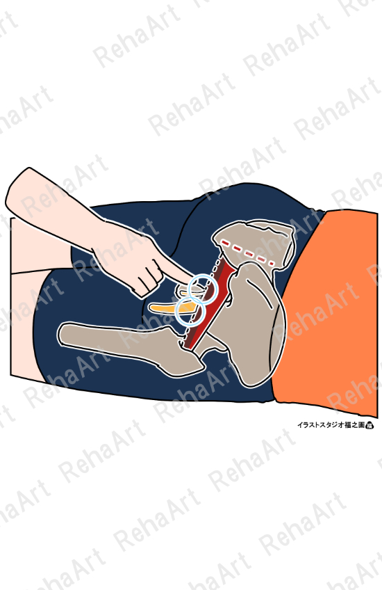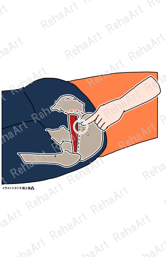 ・坐骨神経・下殿神経圧痛所見:梨状筋の下縁に沿って圧を加え、疼痛の有無を評価する