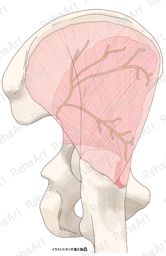 上殿神経の走行、小殿筋・中殿筋の筋線維や起始停止などが詳細にわかるイラストです。