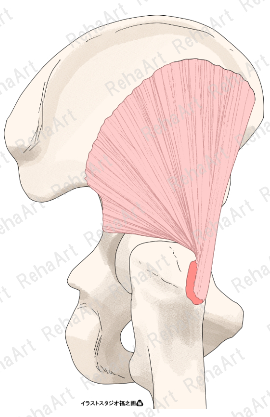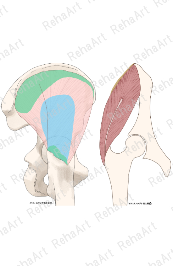 ●中殿筋(起始停止):前部線維・後部線維の走行、殿筋膜・内部腱膜の起始停止を描いた中殿筋