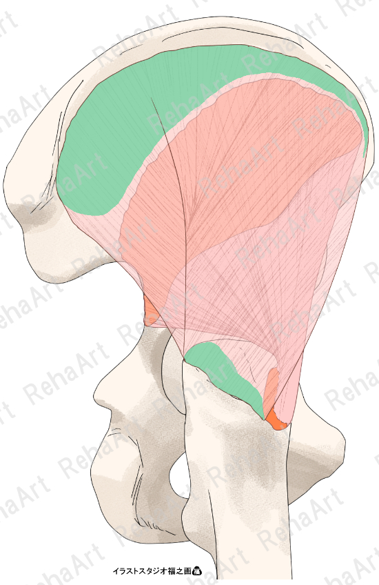 ●小殿筋・中殿筋(起始停止):小殿筋と起始停止(オレンジ)、中殿筋の起始停止(グリーン)