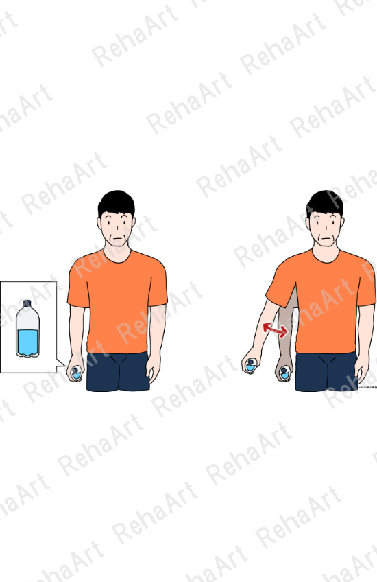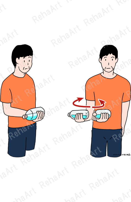 肩関節周囲筋の筋力トレーニングのイラストです。方法の説明や自主トレーニングの資料用などに活用することができます。 ●棘上筋トレーニング1:肩関節外転の初動から軽度外転位までの運動。 ●棘上筋トレーニング2:肩関節外転の45°から80°までの運動。 ●棘下筋・小円筋トレーニング1:ペットボトルを用いた低負荷の運動。 ●棘下筋・小円筋トレーニング2:ゴムチューブを用いた運動。 ●肩甲下筋トレーニング:ゴムチューブを用いた運動。
