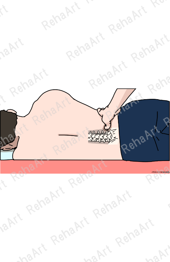 ●椎間関節圧痛テスト:椎間関節の評価として、圧を加え疼痛を誘発する様子です。