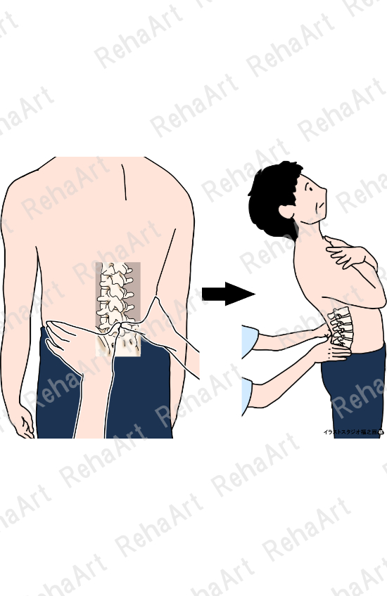 腰椎伸展の運動や評価、椎間関節の評価などのイラストです。