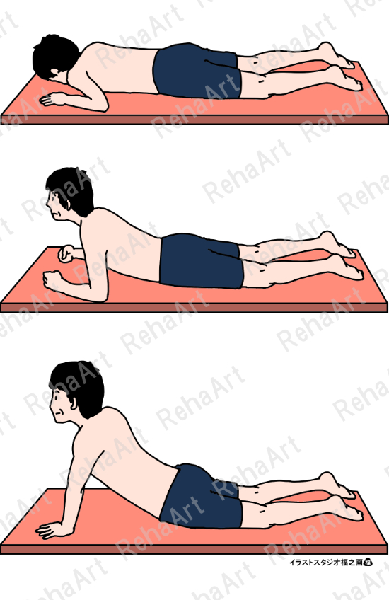 ●胸椎・腰椎伸展運動:腹臥位から始める胸椎と腰椎の伸展運動です。可動域評価やエクササイズとしても活用できます。