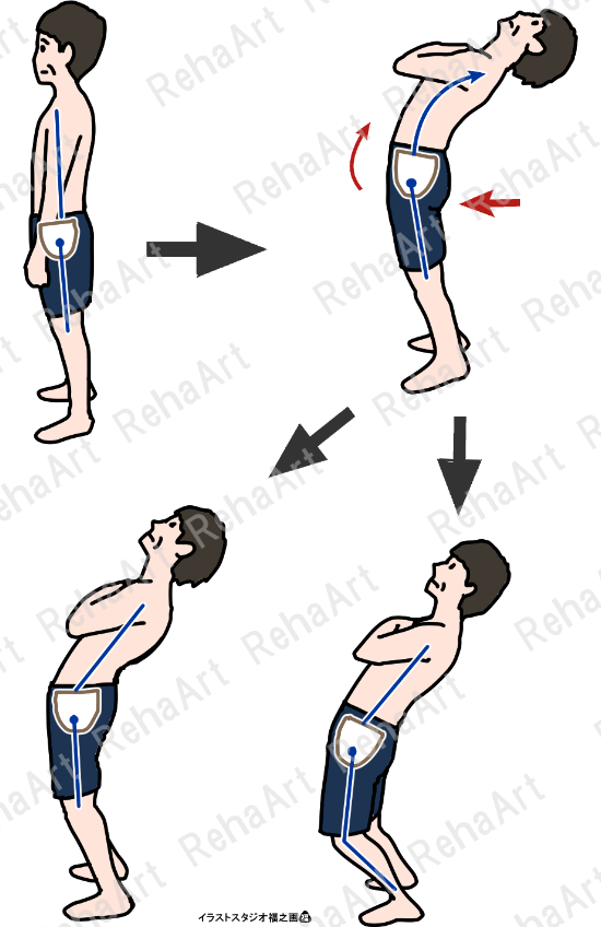 ●腰椎伸展動作(正常動作・代償動作):立位の腰椎伸展で見られる正常動作(上段)と代償動作(下段)です。動作観察や可動域評価に活用できます。