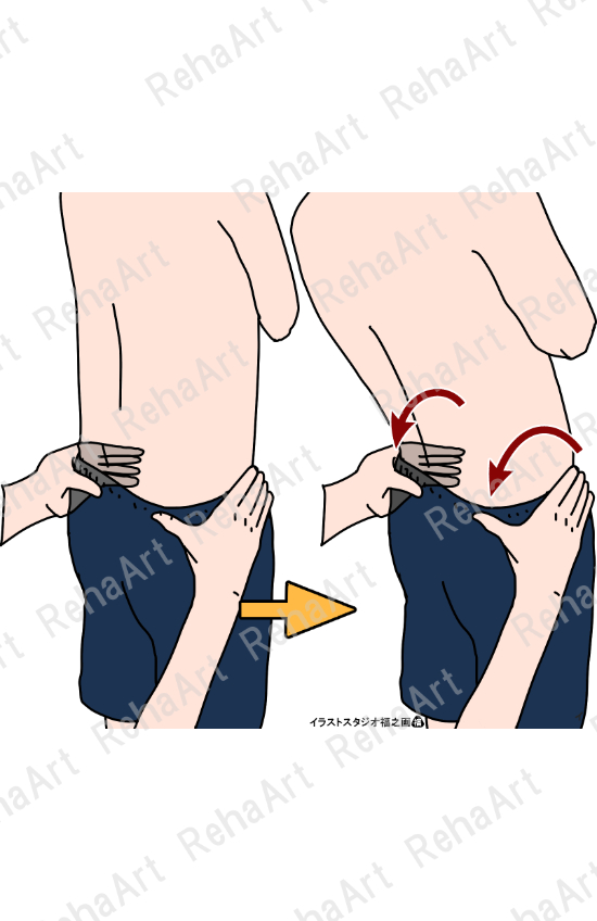 ●腰椎伸展補助:伸展に伴い寛骨の後方回旋を補助する様子です。