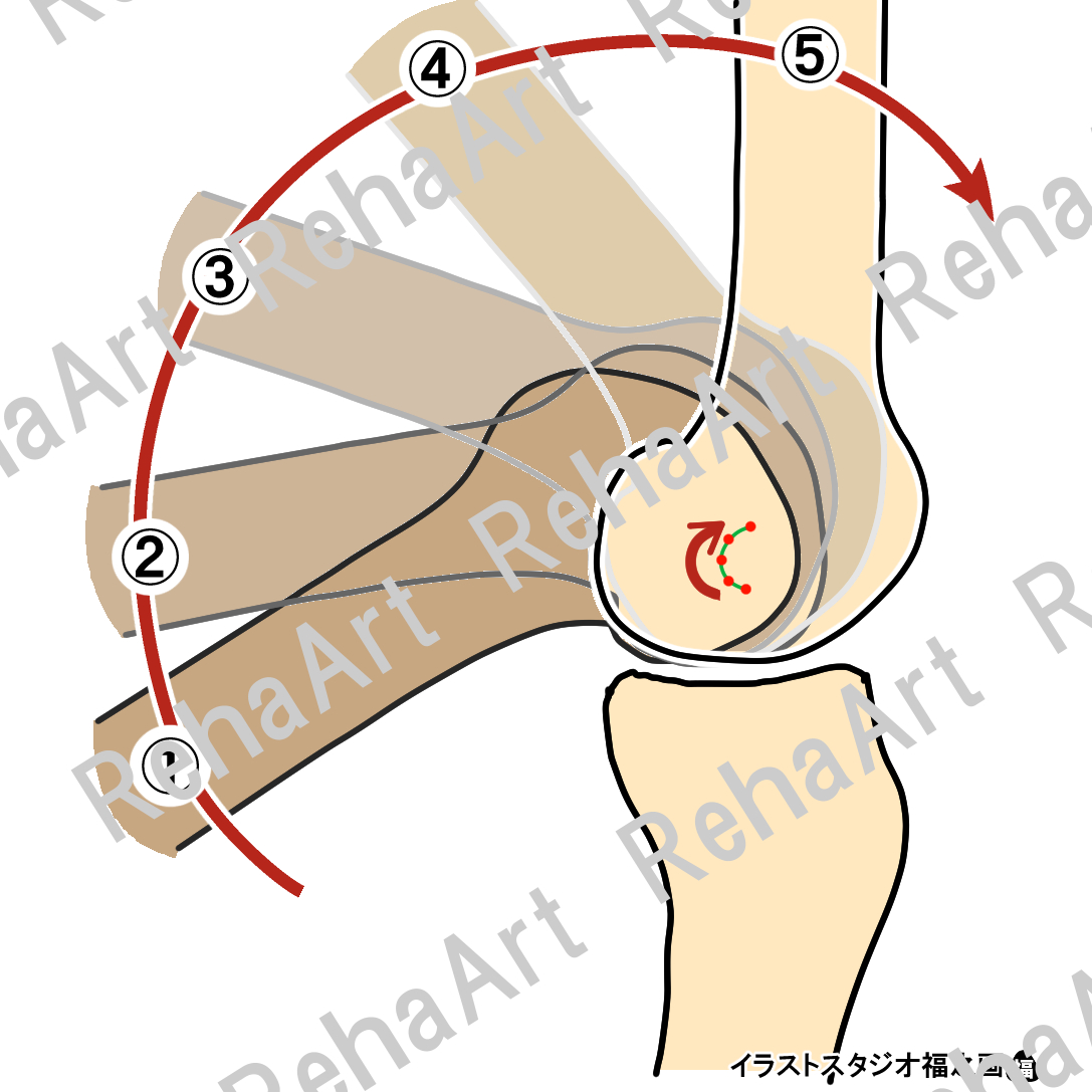 膝関節③:十字靭帯による大腿骨脛骨関節の滑り運動、内側側副靭帯と外側側副靭帯の屈曲に伴う緊張の違い、膝関節の屈曲・伸展運動での回転軸の移動、スクリューホームムーブメント①②(5点セット)