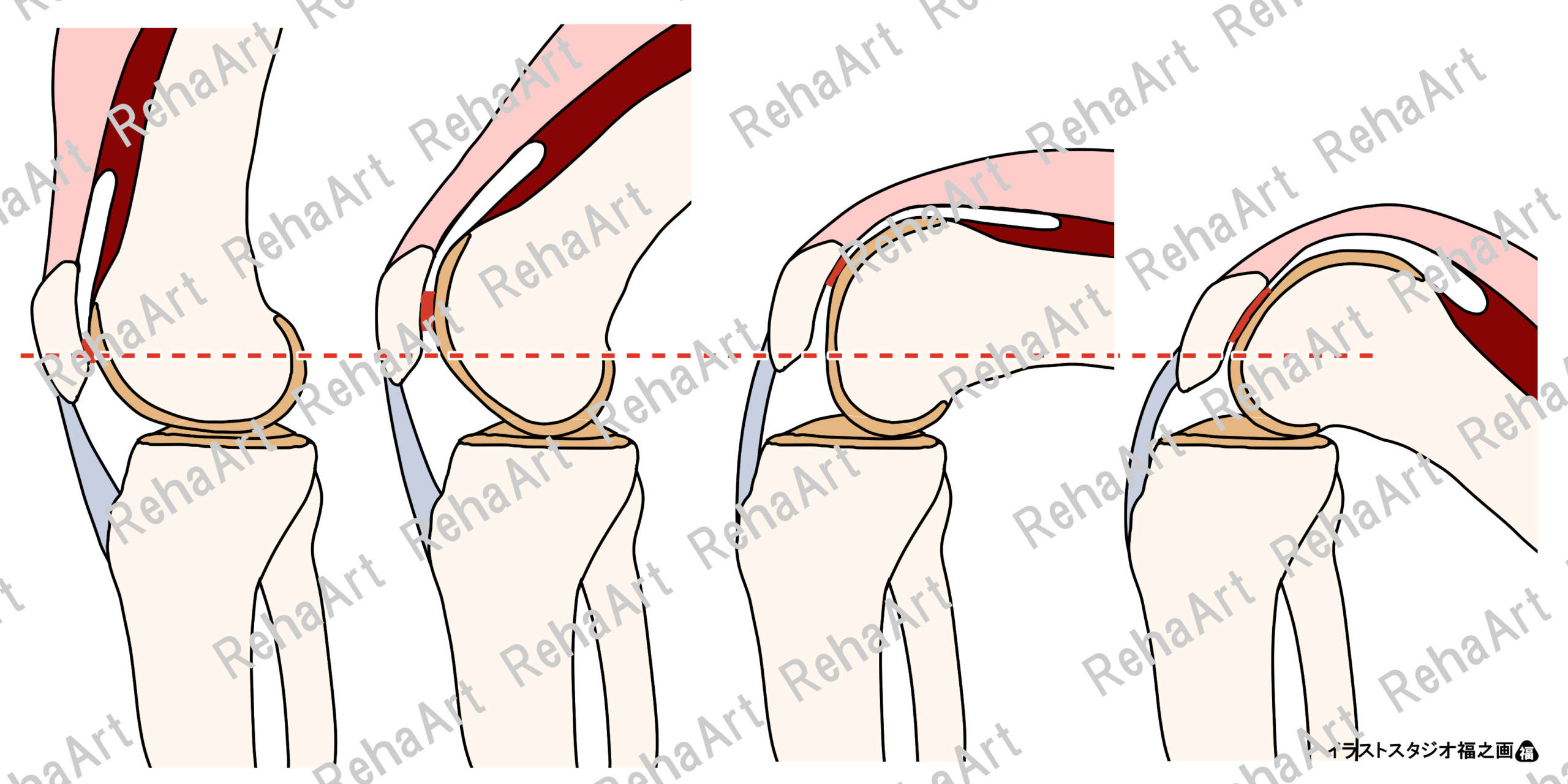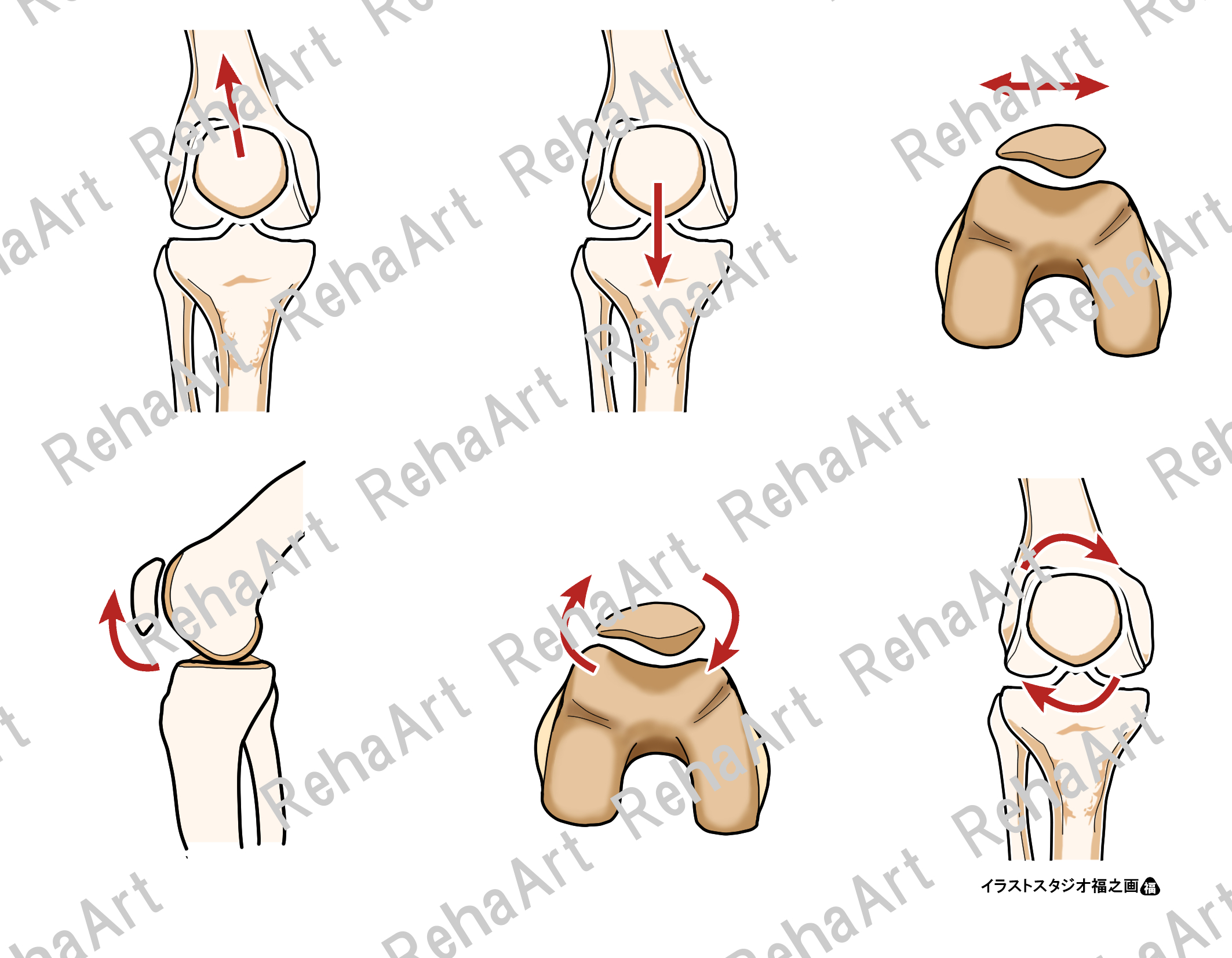 十字靭帯の基本的な解剖学図と膝蓋骨・膝蓋大腿関節についてのイラストです。 ・後十字靭帯と前十字靭帯1:矢状面 ・後十字靭帯と前十字靭帯2:前額面 ・膝蓋骨の運動:膝蓋骨の運動6パターン ・膝関節屈曲に伴う膝蓋骨の位置:膝関節屈曲に伴い膝蓋骨はやや上方へ移動 ・膝蓋骨関節面の大腿骨との接地面:膝関節屈曲角度による接地面の変化
