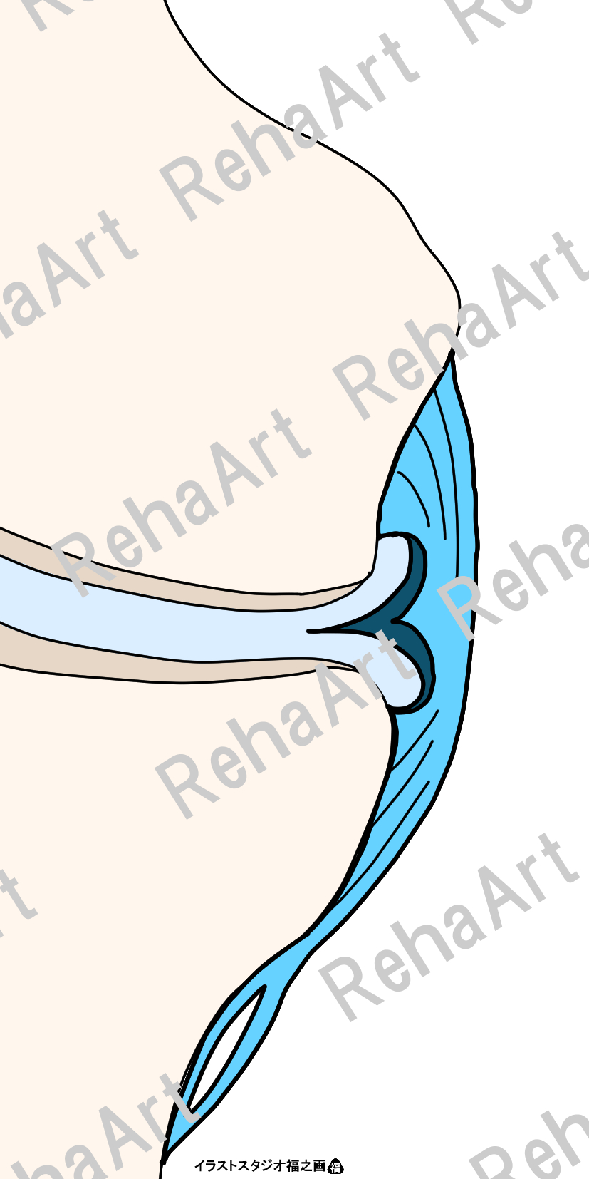 ・内側側副靭帯(深層):内側関節包靭帯とも呼ばれる深層線維は、大腿骨側を半月大腿靭帯、脛骨側を半月脛骨靭帯として内側半月板と結合していることを表現。