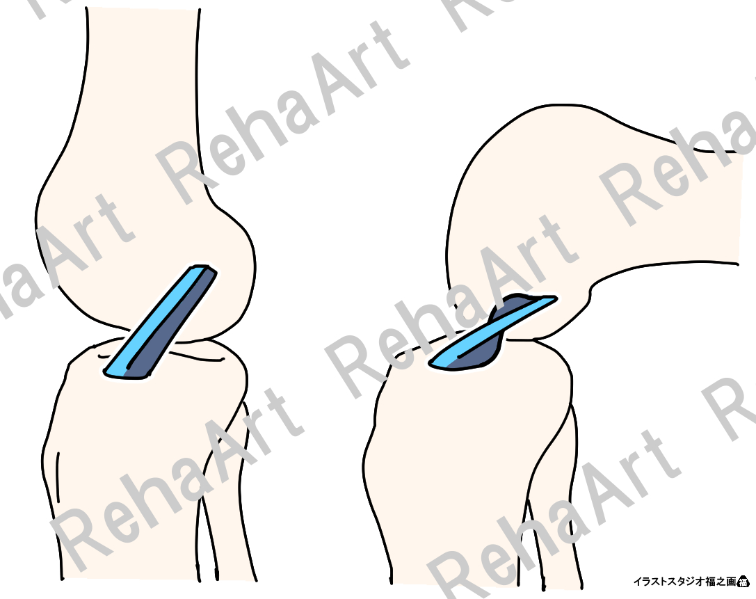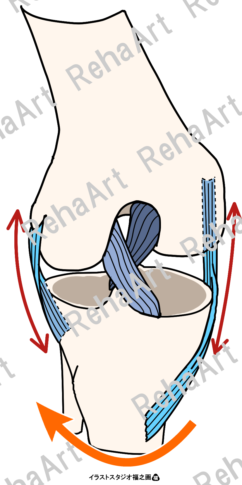 ・十字靭帯(脛骨内旋制動):脛骨が内旋すると十字靭帯は捻じれるように絡むことで過剰な内旋を制動していることを表現。