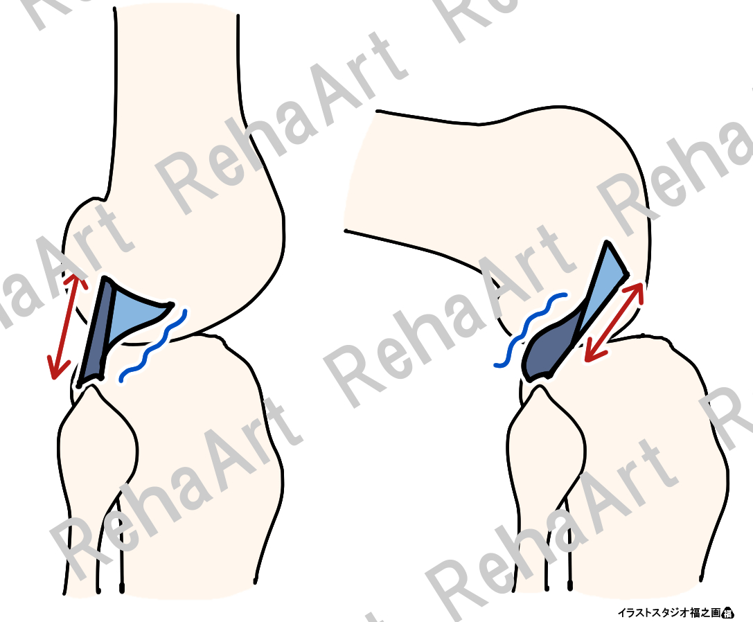 ・後十字靭帯(前外側線維束・後内側線維束):前外側線維束は伸展位では弛緩し、屈曲に伴い緊張すること、対して後内側線維束は屈曲で弛緩し、伸展に伴って緊張することを表現。
