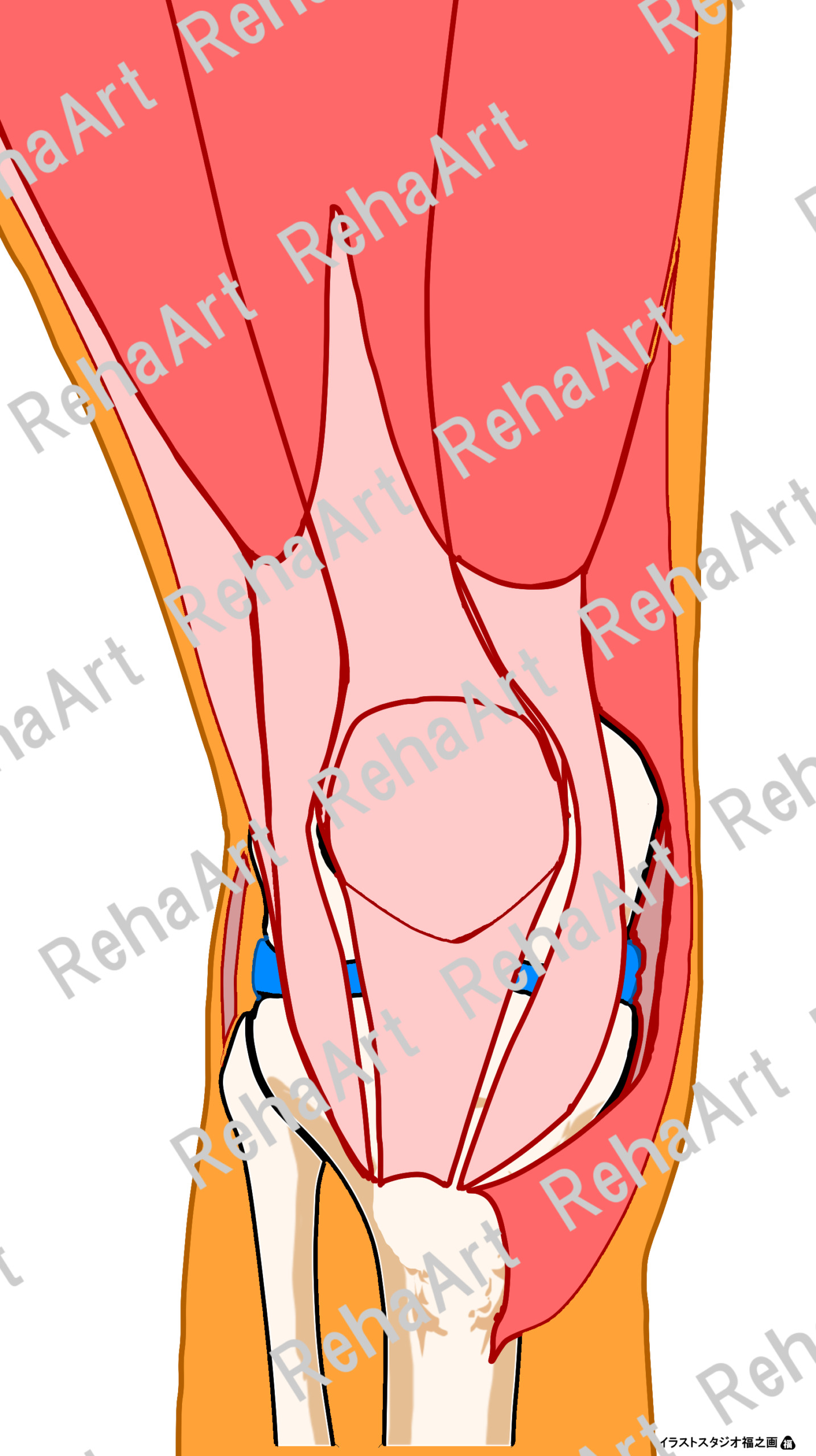 ・内側膝蓋大腿靭帯・外側膝蓋大腿靭帯:内側膝蓋支帯の深層に内側膝蓋大腿靭帯、外側膝蓋支帯の深層に外側膝蓋大腿靭帯がそれぞれ位置し、膝蓋骨と大腿骨を結ぶことを表現