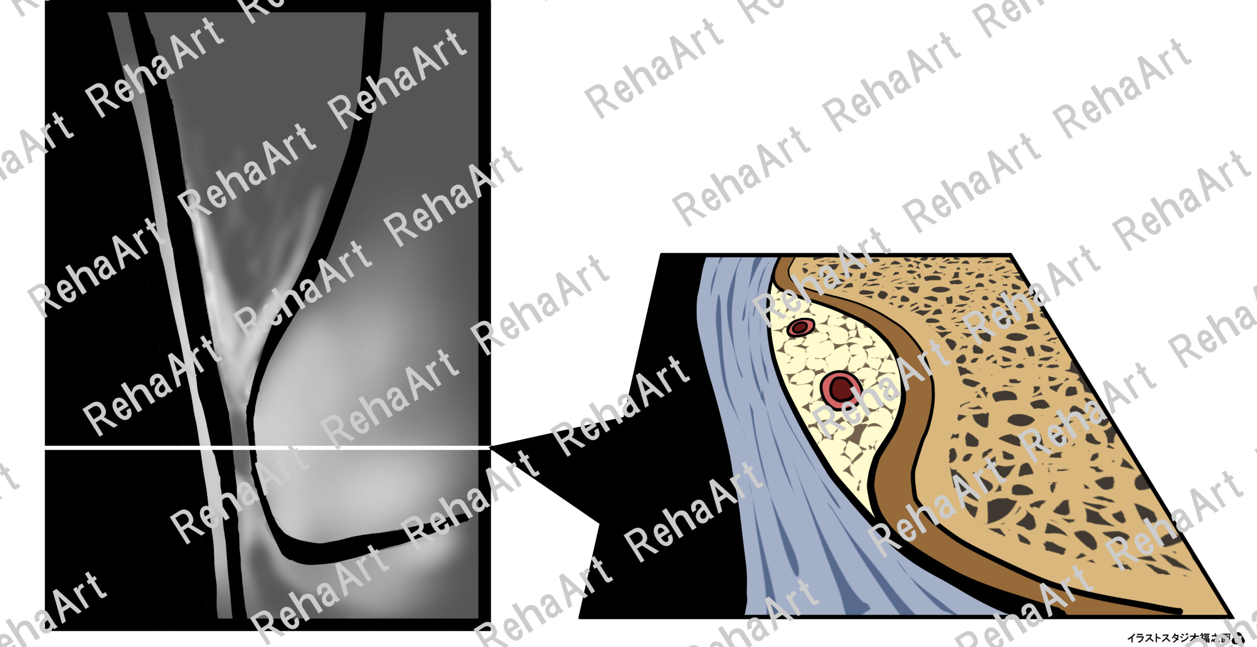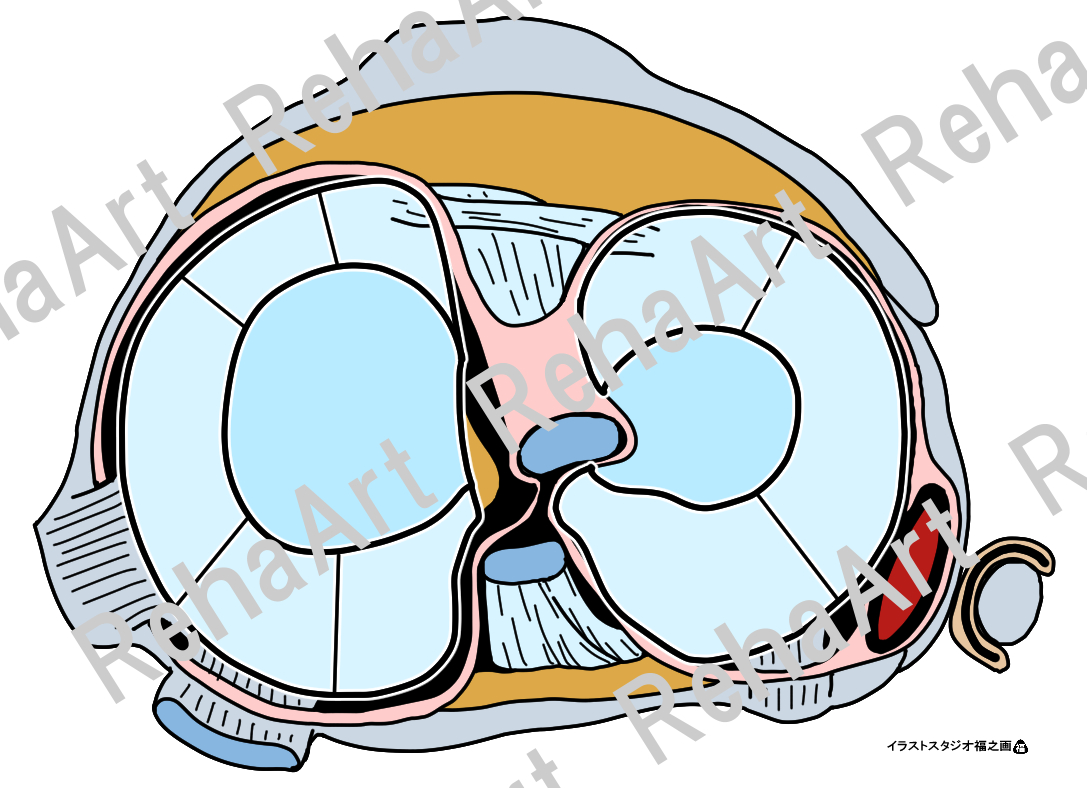 ・半月板:前角・前節・中節・後節・後角を線で区切って表現
