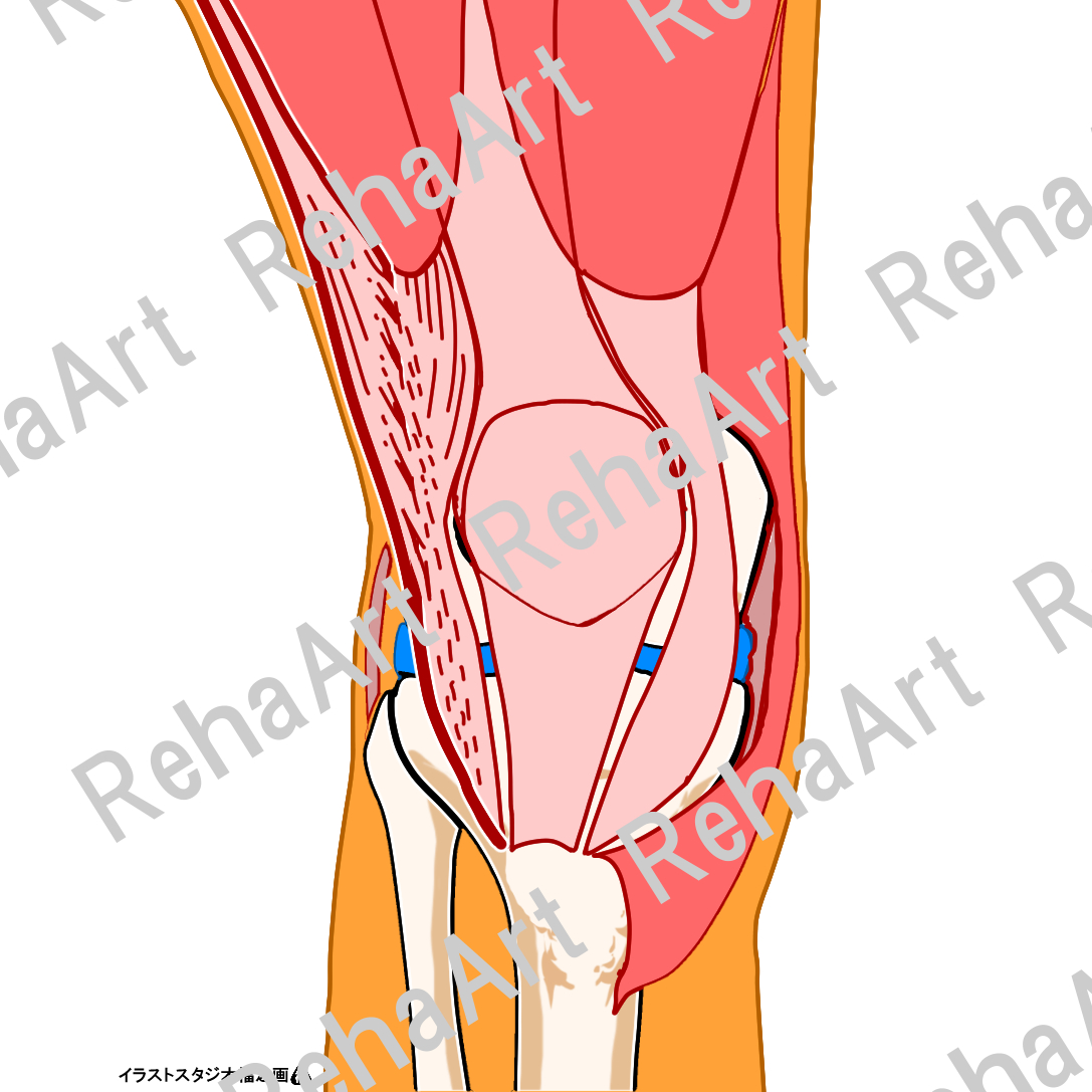 腸脛靭帯・ファベラ腓骨靭帯・弓状膝窩靭帯・斜膝窩靭帯・半月板についてのイラストです。
