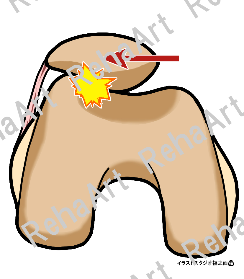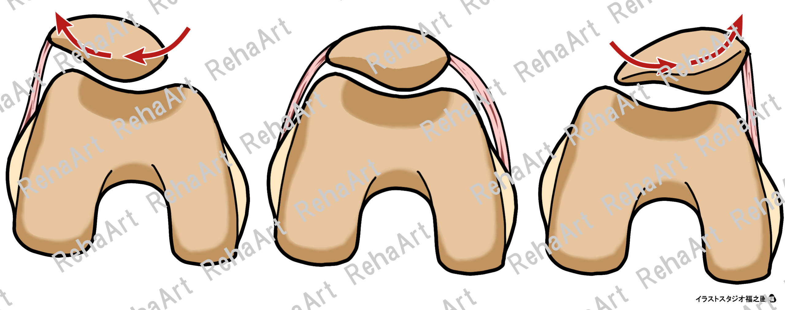 膝関節のティルティング操作のイラストです。 ・ティルティング操作(ハンドリング):膝蓋骨を正面に捉えた際の操作方向 ・ティルティング操作(膝蓋骨内外側操作):内側・外側へ操作する際の膝蓋骨の操作方向 ・ティルティング操作(誤った操作):骨の形状にそぐわない動きは骨が衝突する ・ティルティング操作(外側):骨形状をイメージしながら外側方向へと操作する ・ティルティング操作(内側):骨形状をイメージしながら内側方向へと操作する