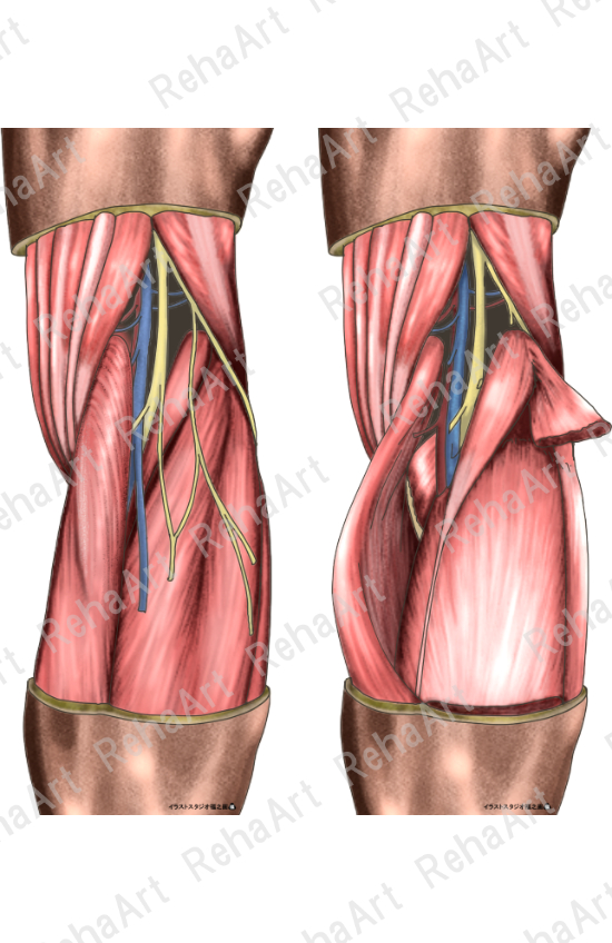 ●下腿三頭筋:下腿三頭筋である腓腹筋・ヒラメ筋、そして、足底筋・脛骨神経・総腓骨神経・膝窩動脈・膝窩静脈・膝窩筋
