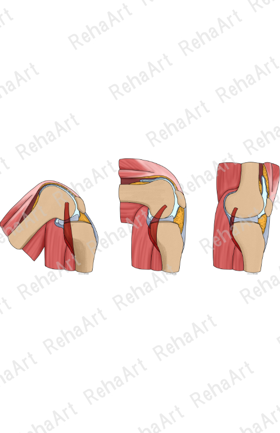 膝関節の膝窩、屈曲伸展運動、伸展位の解剖を描いたイラストです。
