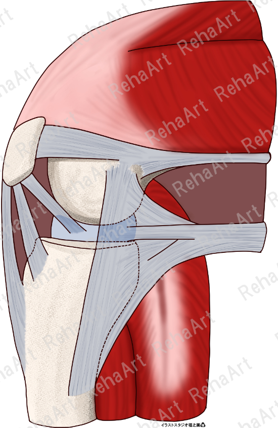 ●膝関節伸展位(内側):内側から見た膝関節伸展位の骨・筋・半月板・靭帯・滑液包などの位置