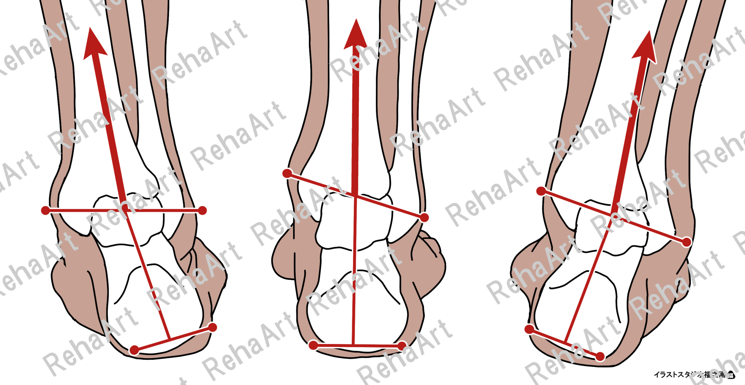 ・Leg-heel-alignment(レッグヒールアラインメント)①:荷重位による距骨下関節の測定方法。イラストは正常と下腿傾斜を伴わない距骨下関節の回内・回外位。