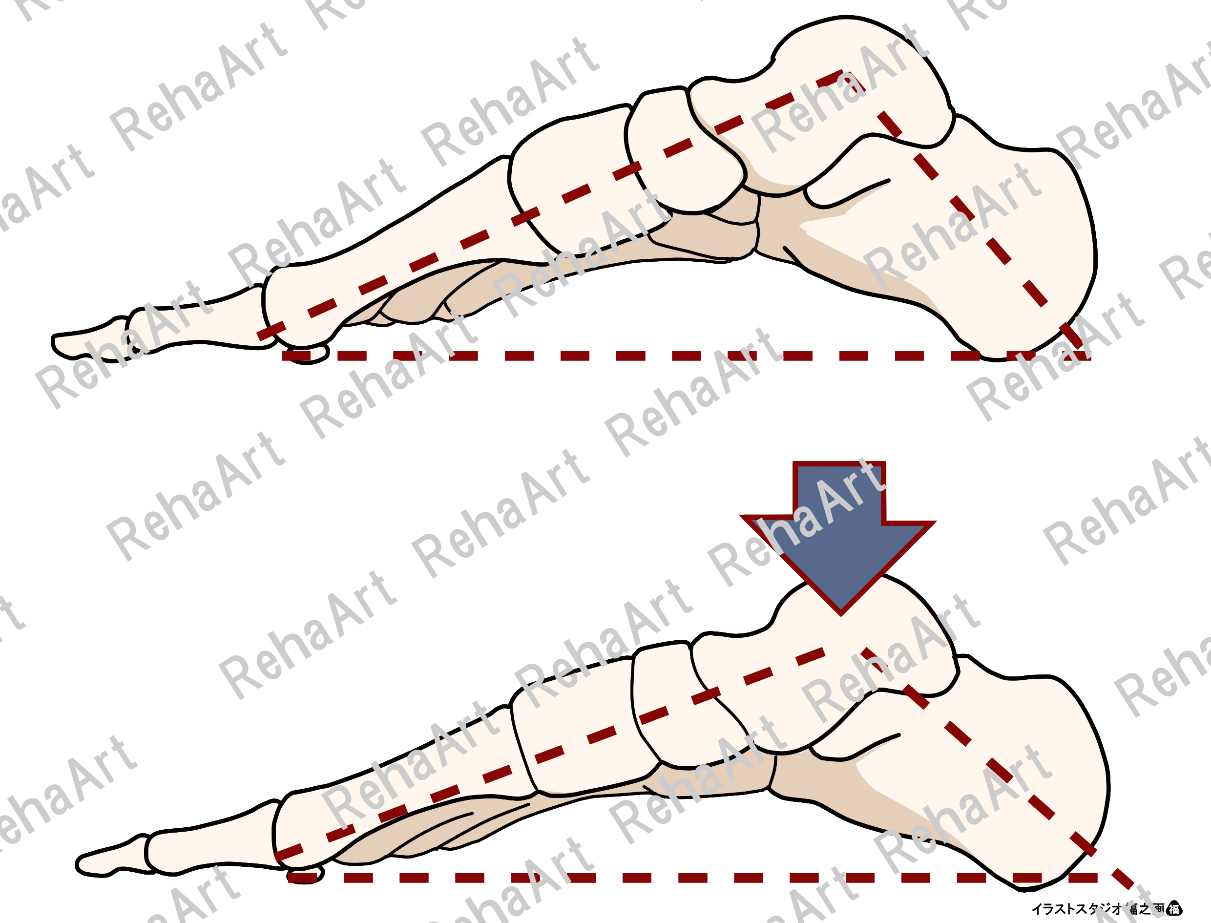 足部のウィンドランス機構・トラス機構・外側内側靭帯・横アーチのイラストです。 ・ウィンドランス機構:足部へかかる力の伝達機能 ・トラス機構:足部へかかる力の分散と吸収機能 ・外側側副靭帯:前距腓靭帯・後距腓靭帯・踵腓靭帯 ・三角靭帯(内側側副靭帯):脛舟部・前脛距部・後脛距部・脛踵部 ・横アーチ:中足部横アーチ・前足部横アーチ