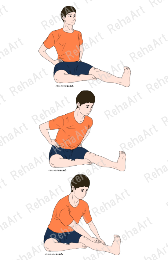 ●下肢ストレッチング(大腿下腿後面:座位):ハムストリングス、下腿三頭筋のストレッチングを床に座って行う方法