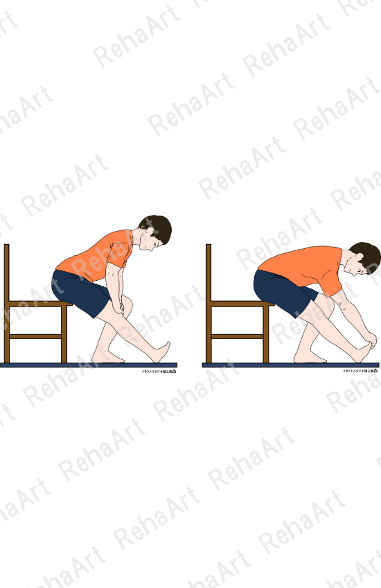 ●下肢ストレッチング(大腿下腿後面:椅子座位):ハムストリングス、下腿三頭筋のストレッチングを椅子に座って行う方法