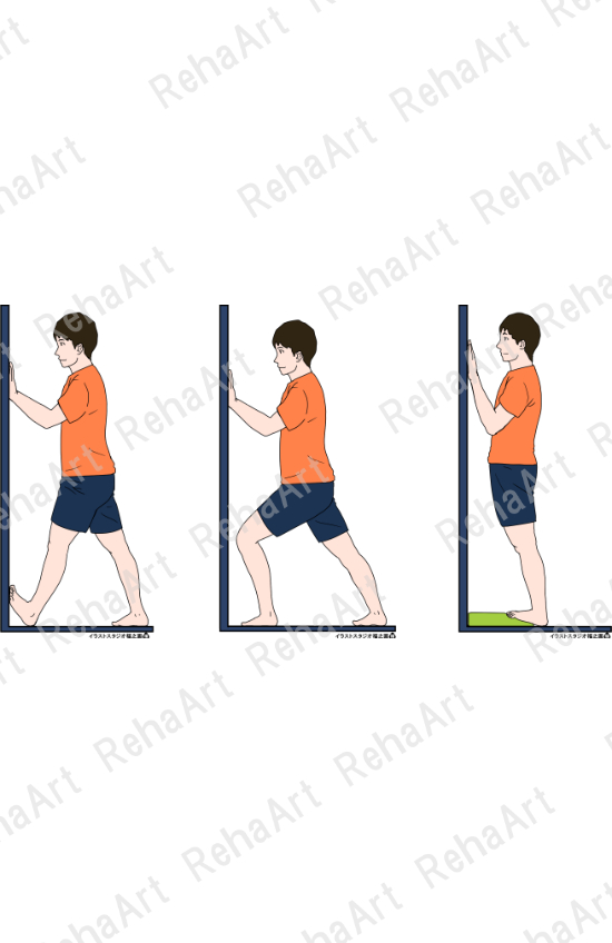 ●ヒラメ筋ストレッチング(壁):立位にて壁を使用したヒラメ筋のストレッチング方法