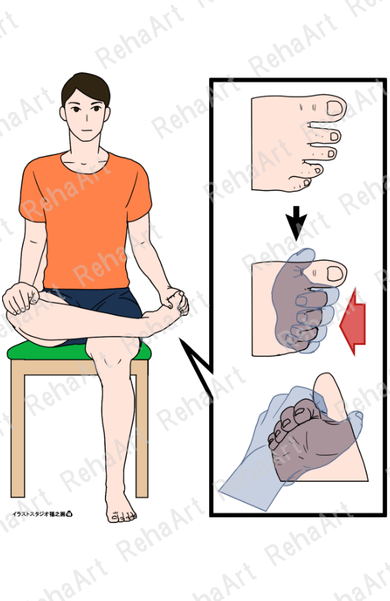 ●長趾伸筋ストレッチング(椅子座位):第2~第5趾屈曲位から足関節底屈・回外位へ