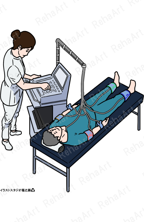 ●ABI(足関節上腕血圧比)測定:足関節と上腕の血圧を比較し、末梢血流状態を評価する検査の様子